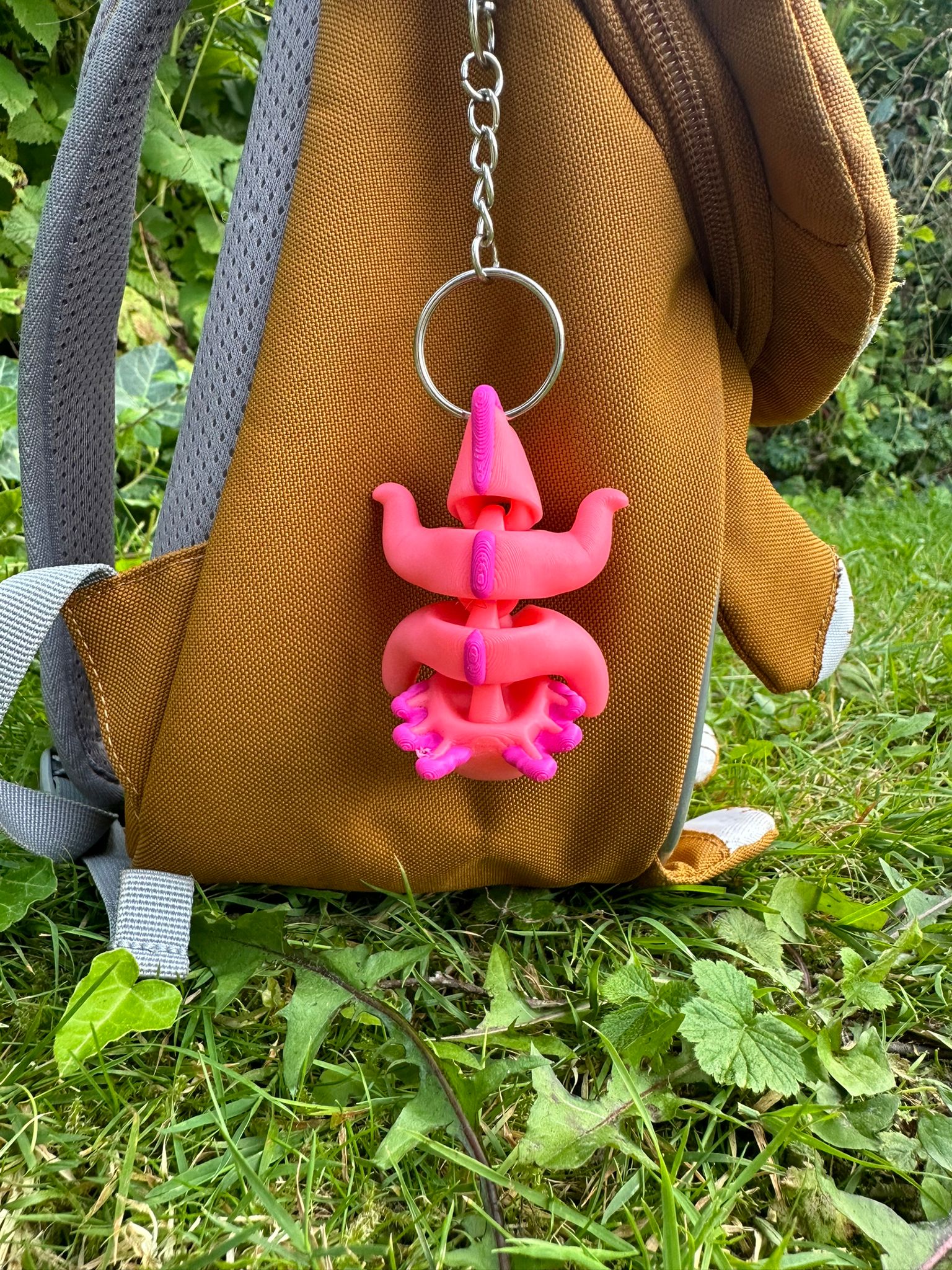 Durch den Karabiner kannst du ihn super an deinen Rucksack, Tasche oder Schlüsselbund befestigen, die Kette mit Karabiner ist ca. 6 cm lang.