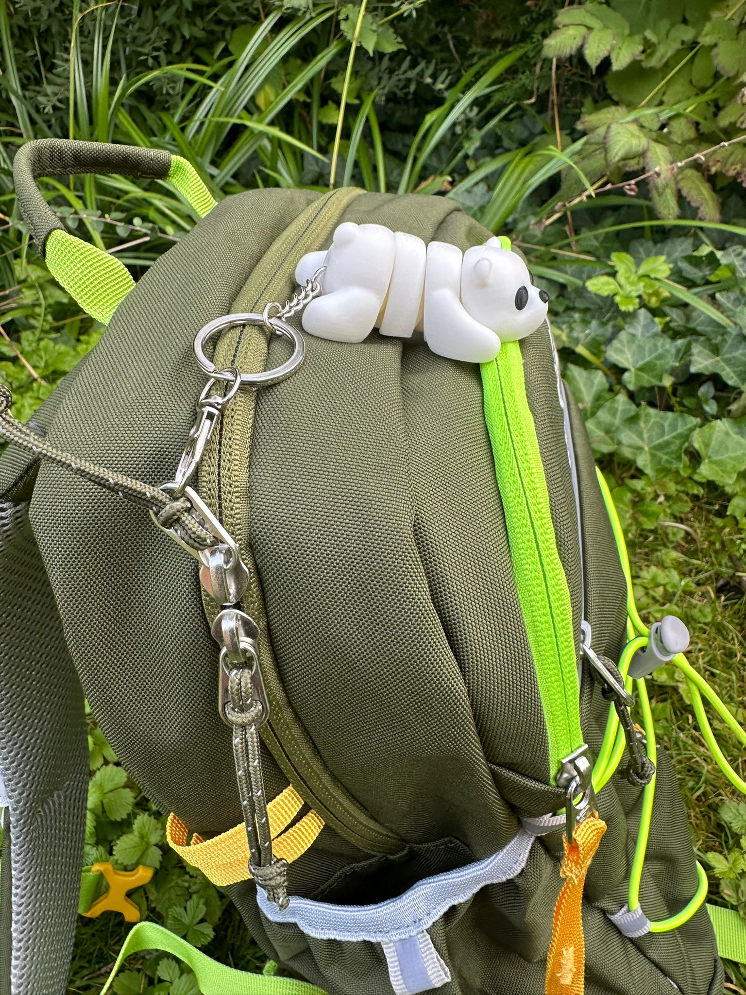 Durch den Karabiner kannst du ihn super an deinen Rucksack, Tasche oder Schlüsselbund befestigen, die Kette mit Karabiner ist ca. 6 cm lang.